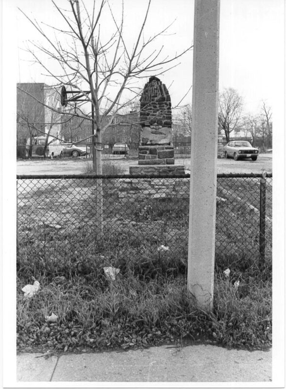 Partially visible in some photographs is a rubble stone cairn inset with a bronze plaque. The earliest reference to it found so far dates to 1921, when City Council voted monies to cover “the repairs required to the monument of St. John's Church.” In 1929 the cairn was described as “a monument . . . erected by the men of the Stanley Barracks.” Passing references through the 1940s make clear that memorial wreaths were placed there on Remembrance Day and other occasions. The cairn remained until 1982 at least, and probably until the property was sold in 1985, long after the church had been demolished and its site was being used as a parking lot.